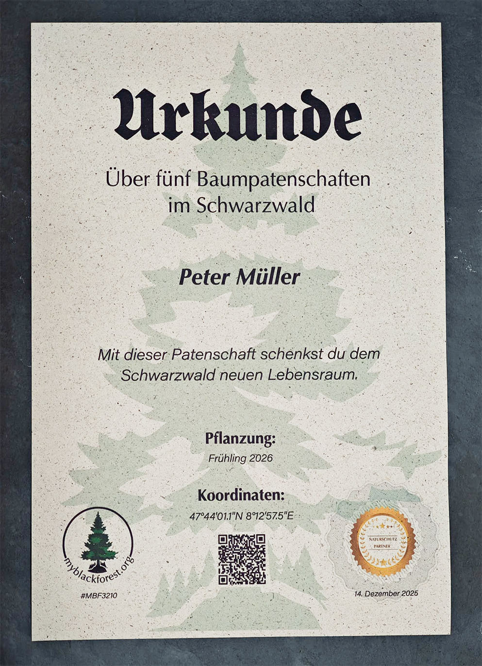 - 📜 Gedruckte Urkunde auf Graspapier: Die Urkunde der Baumpatenschaft wird auf umweltfreundlichem Graspapier gedruckt